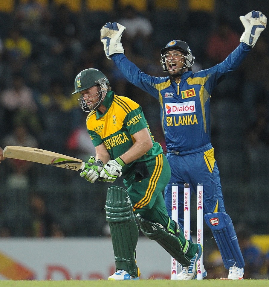| Sangakara rejoices after fall of de Villiers's wicket |